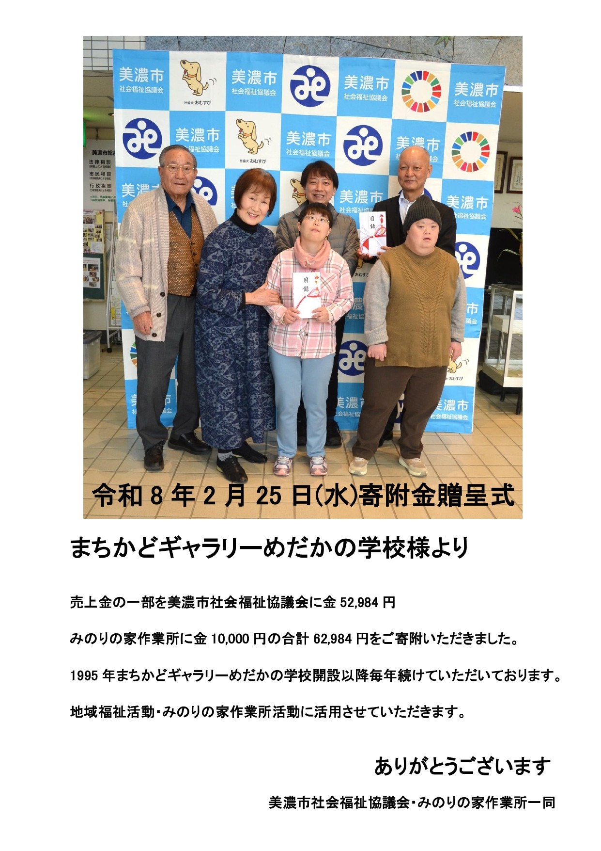 まちかどギャラリーめだかの学校様よりご寄附をいただきました。